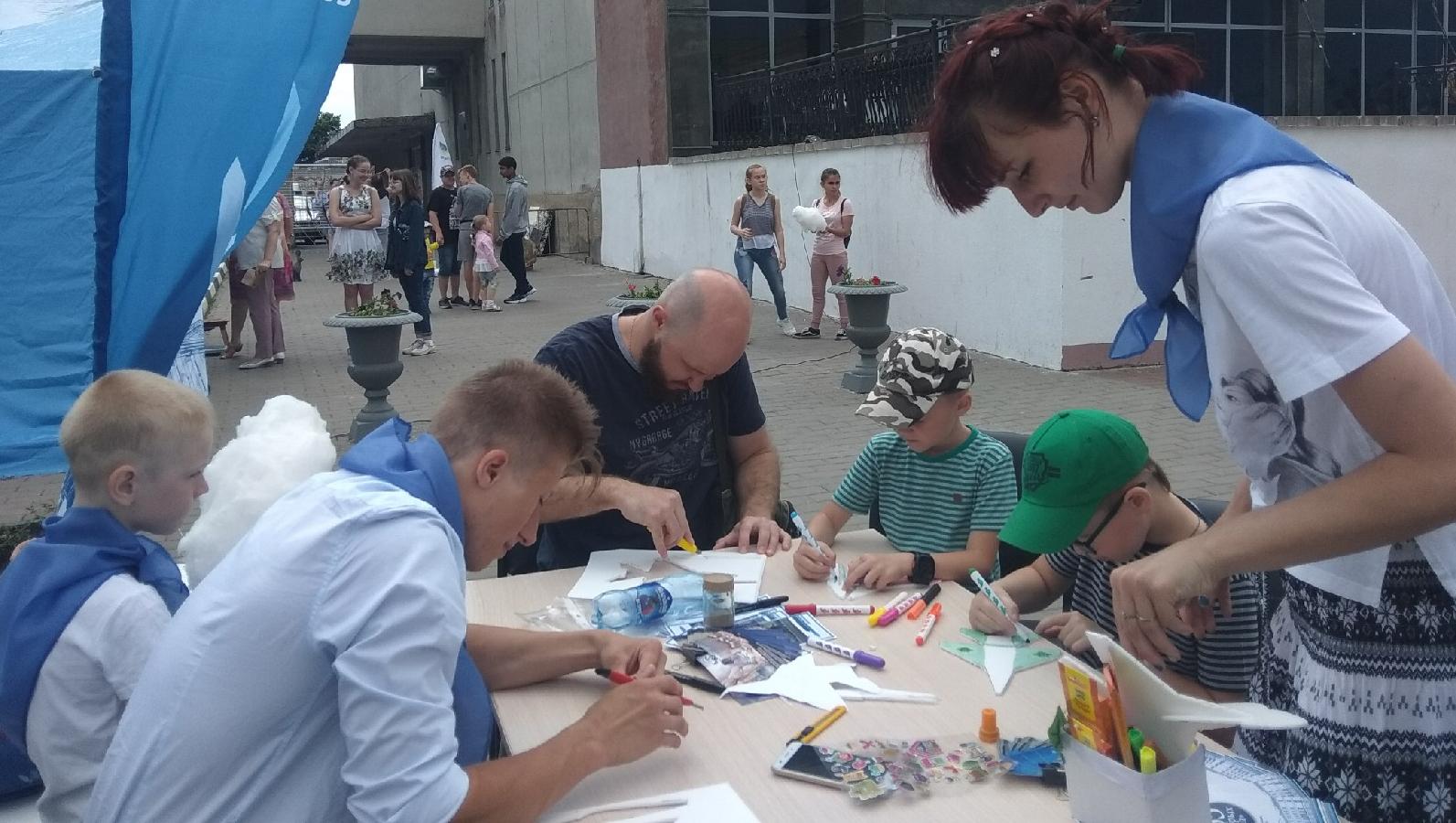 На площади для детей была масса интересных развлечений. От Старооскольского филиала МГРИ были организованы 4 интерактивные площадки. Ребята, члены студенческого самоуправления, предлагали всем желающим мастер-класс по изготовлению больших самолетов в технике оригами.