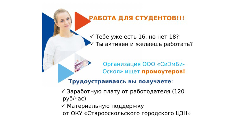 Старооскольский городской центр занятости населения информирует студентов о возможности трудоустройства, без отрыва от образовательного процесса. Идет набор студентов, в том числе несовершеннолетних, на должность «промоутер».
